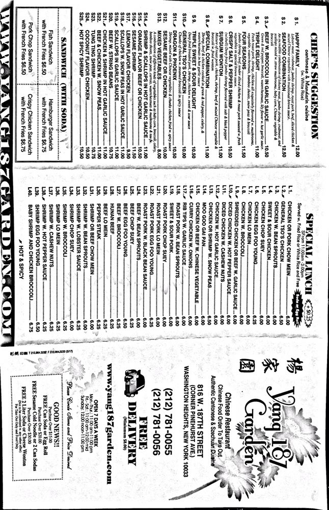 Yang Garden, located in New York at 816 W 187th St, is a delightful establishment offering a diverse menu featuring soup, sandwiches, and Chinese cuisine. The restaurant provides a range of utilities including delivery, takeout, reservations, and accepts credit cards and even cryptocurrency. With a casual and quiet ambiance, it is perfect for groups, families with kids, and even allows dogs. Outdoor seating, catering services, and alcohol options are also available. The menu at Yang Garden is sure to impress with its flavorful dishes and unique combinations. From comforting soups to savory sandwiches and authentic Chinese specialties, there is something for everyone to enjoy. Don't miss out on the chance to experience the delicious offerings at Yang Garden.